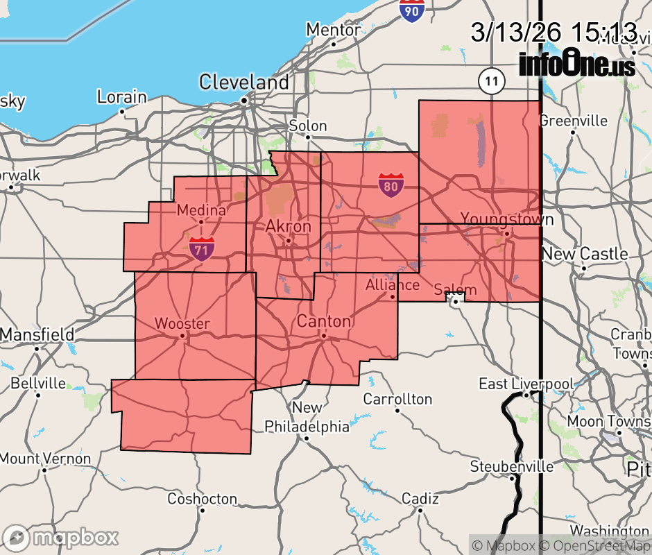 Canceled 3/13/26 7:58 PM High Wind Warning issued March 13 at 3:11PM EDT until March 13 at 8:00PM EDT by NWS Cleveland OH * WHAT... Southwest to west winds 25 to 35 mph with gusts up to 60 to 70 mph. * WHERE... Holmes, Mahoning, Medina, Portage, Stark, Summit, Trumbull, and Wayne Counties. * WHEN... Until 8 PM EDT this evening. * IMPACTS... Damaging winds will blow down trees and power lines. Widespread power outages are expected. Travel will be difficult, especially for those in high profile vehicles. ![]() |