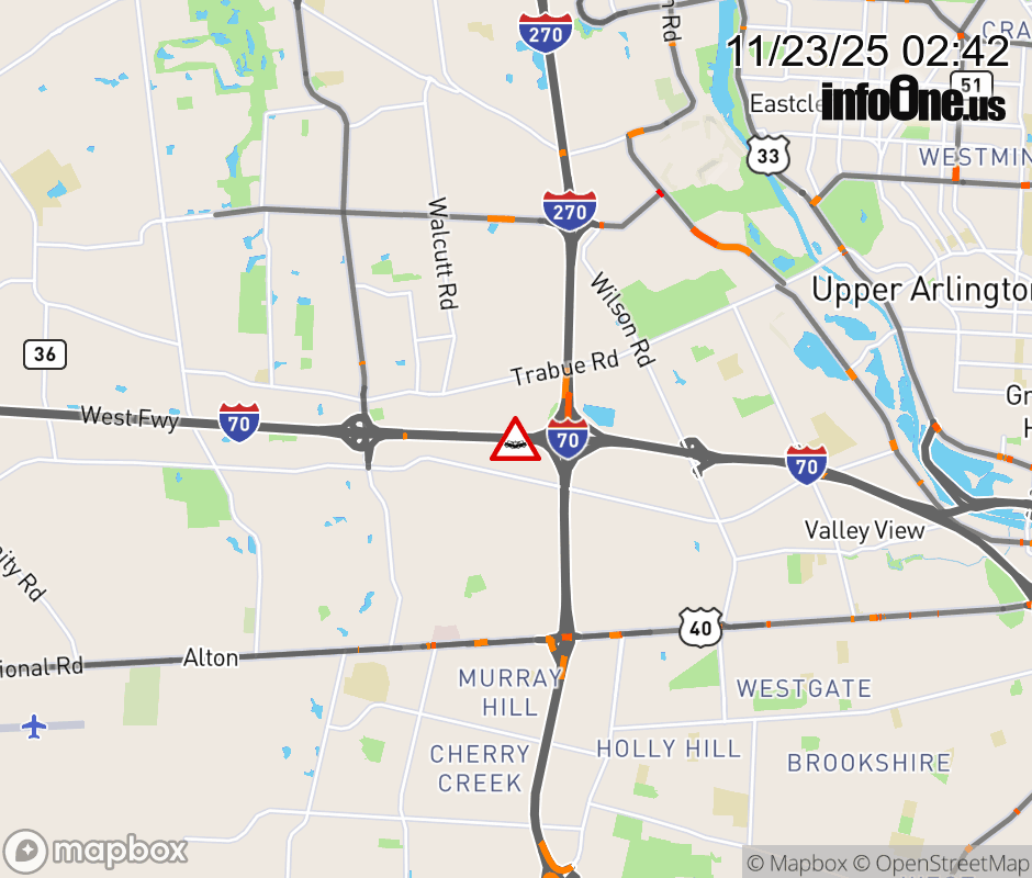 The right shoulder is blocked on I-70 East at I-270 South, due to a crash. Updated: Sun 11/23/25 2:42 AM EST ![]() Updated: Sun 11/23/25 2:42 AM EST |