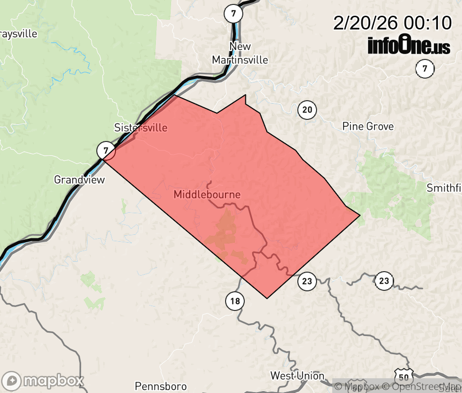 Canceled 2/20/26 12:39 AM Severe Thunderstorm Warning issued February 20 at 12:08AM EST until February 20 at 12:45AM EST by NWS Charleston WV SVRRLX The National Weather Service in Charleston West Virginia has issued a * Severe Thunderstorm Warning for... Northern Tyler County in northern West Virginia... * Until 1245 AM EST. * At 1208 AM EST, a severe thunderstorm was located over Middlebourne, moving northeast at 50 mph. HAZARD...Quarter size hail. SOURCE...Radar indicated. IMPACT...Damage to vehicles is expected. * Locations impacted include... Middlebourne, Sistersville, Alma, and Lima. ![]() |
