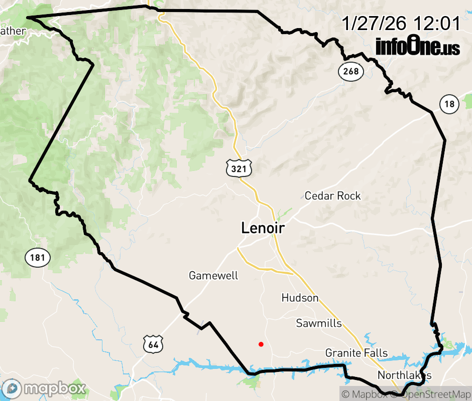 Canceled 1/27/26 12:12 PM Caldwell County has 1 power outage affecting 1 customer. Duke Energy 1 without power Estimated repair: Tue 3:30 PM Updated: Tue 1/27/26 12:01 PM EST ![]() Updated: Tue 1/27/26 12:01 PM EST |