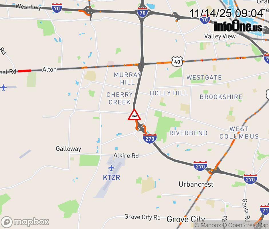 The left shoulder is blocked on I-270 North beyond Georgesville Rd, due to a crash. Updated: Fri 11/14/25 9:04 AM EST ![]() Updated: Fri 11/14/25 9:04 AM EST |