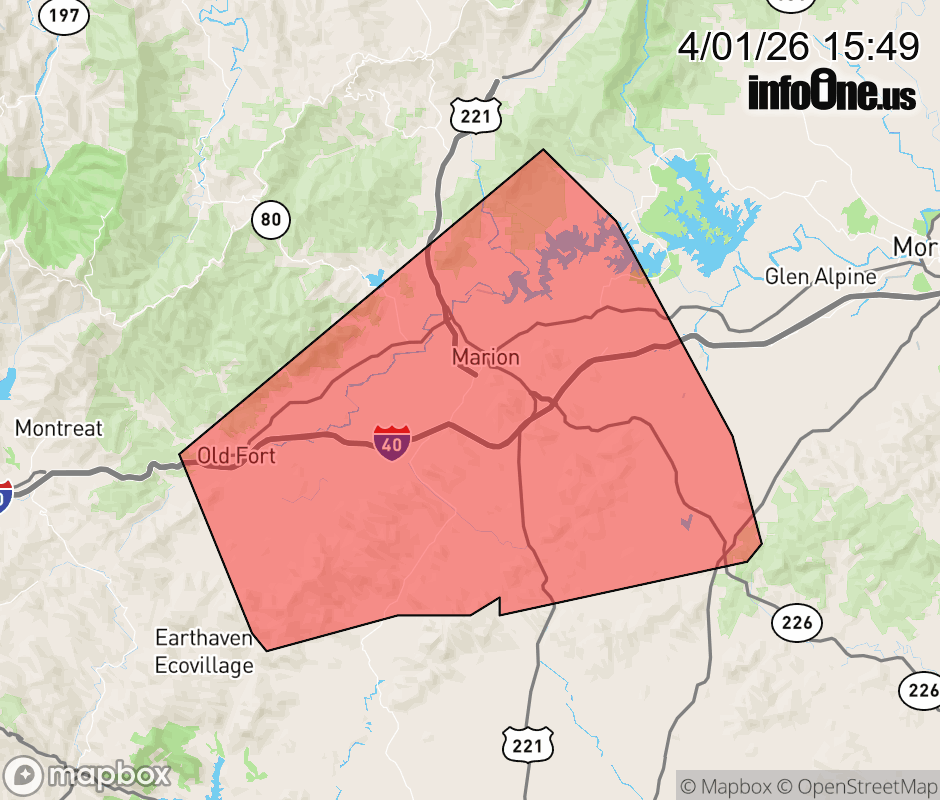 Canceled 4/1/26 4:30 PM Special Weather Statement issued April 1 at 3:47PM EDT by NWS Greenville-Spartanburg SC At 347 PM EDT, Doppler radar was tracking a strong thunderstorm 7 miles southwest of Marion, or 4 miles east of Old Fort, moving northeast at 15 mph. HAZARD...Wind gusts up to 40 mph and pea size hail. SOURCE...Radar indicated. IMPACT...Gusty winds could knock down tree limbs and blow around unsecured objects. Minor hail damage to outdoor objects is possible. Locations impacted include... Marion, Old Fort, Lake James State Park, Lake James, Nebo, Sugar Hill, Pleasant Gardens, Glenwood, Fero, and Dysartsville. ![]() |
