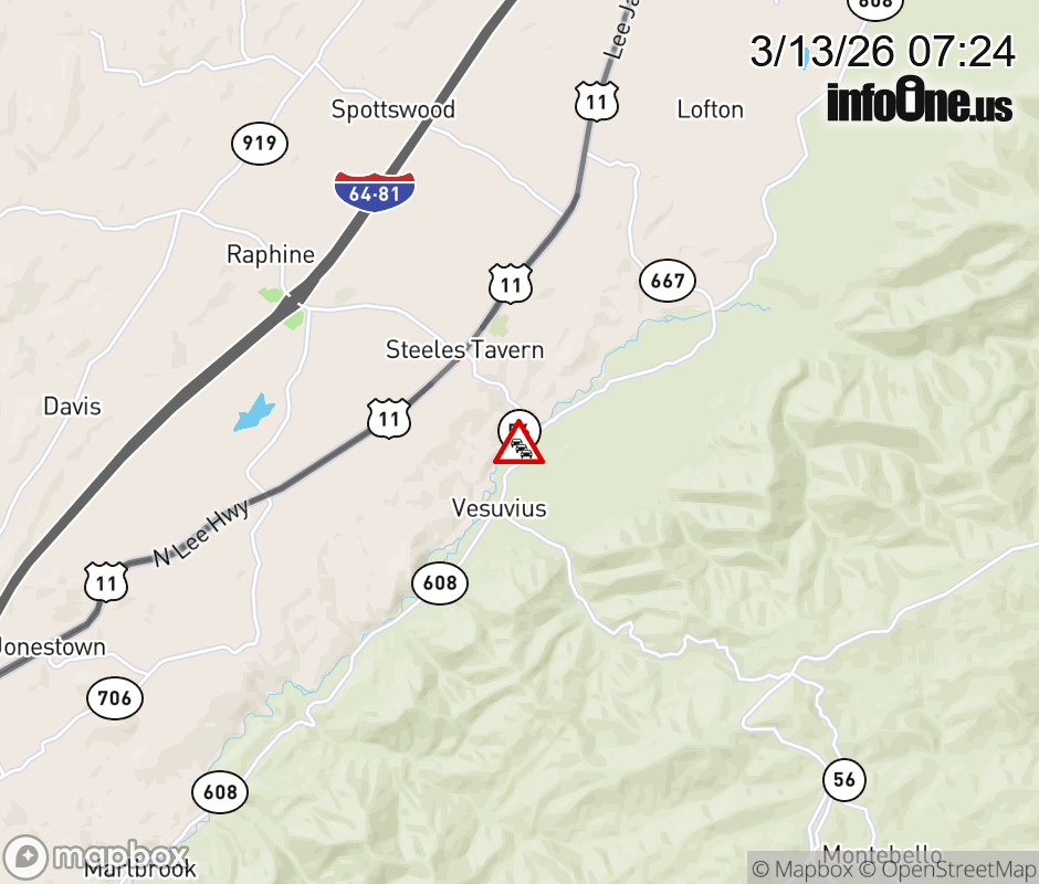On VA-56 in the County of Rockbridge, in the vicinity of S Bottom Rd; Rt. 608N/S (Rockbridge County);S. BOTTOM RD, motorists can expect delays due to an incident. All west lanes are closed. ![]() |