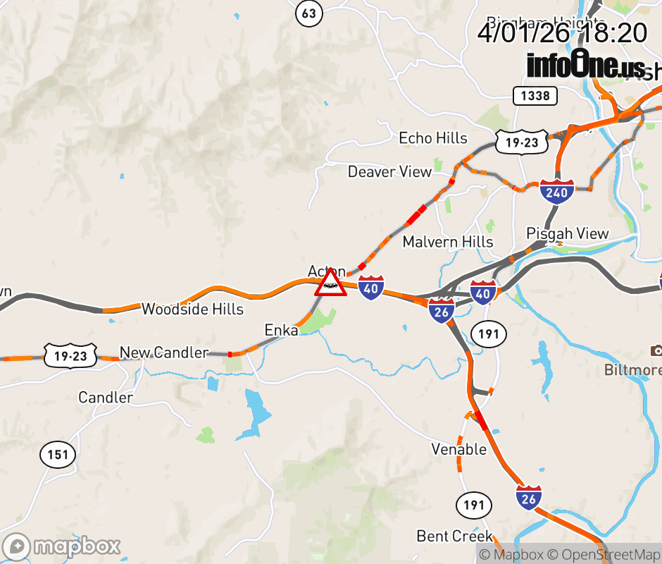 The right lane is closed near Exit 44, US 19 (Smokey Park Highway). ![]() |