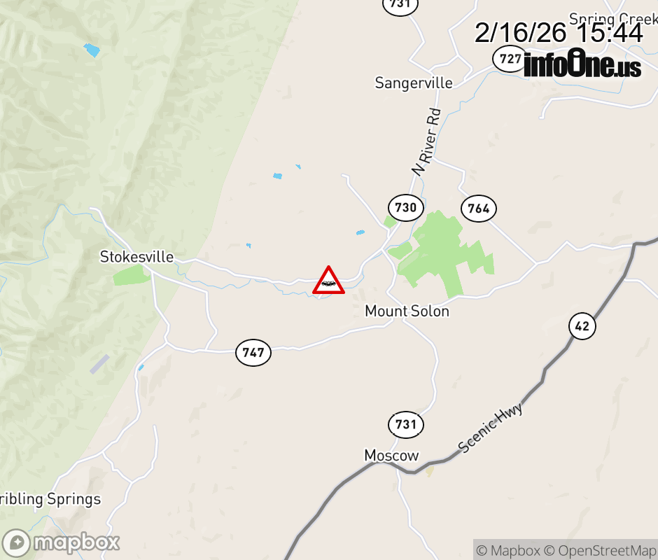 On Rt. 730 in the County of Augusta, in the vicinity of George Waltons Rd; Rt. 758N/S (Augusta County), motorists can expect delays due to a vehicle crash. All north lanes are closed. All south lanes are closed. Updated: Mon 2/16/26 3:44 PM EST ![]() Updated: Mon 2/16/26 3:44 PM EST |