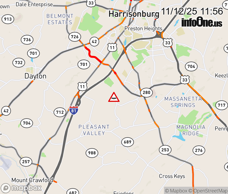 On Rt. 710 in the County of Rockingham, in the vicinity of Greendale Rd; City Rt. 4127E/W (City of Harrisonburg); County/City/Town Line: HARRISONBURG, motorists can expect delays due to a vehicle crash. All south lanes are closed. Updated: Wed 11/12/25 11:56 AM EST ![]() Updated: Wed 11/12/25 11:56 AM EST |