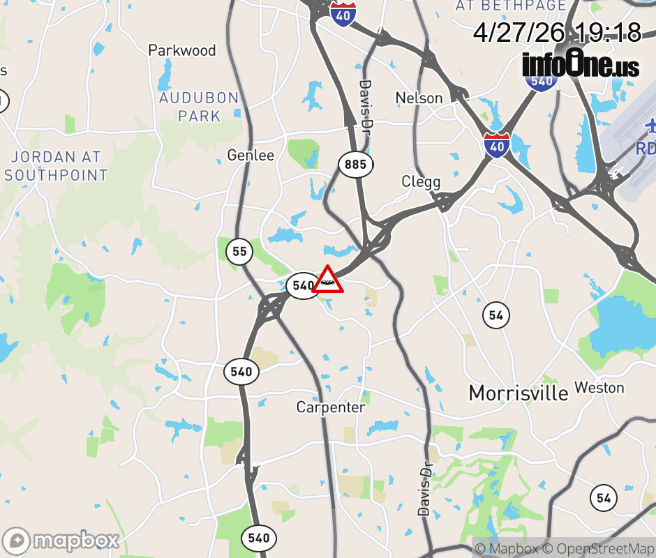 The left shoulder is closed past Exit 66 (NC 55). Updated: Mon 4/27/26 7:18 PM EDT ![]() Updated: Mon 4/27/26 7:18 PM EDT |