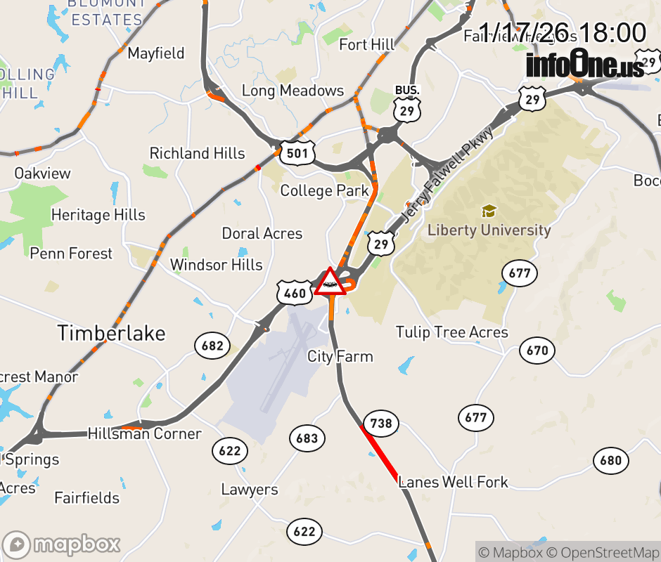 On US-460 West in the County of Campbell, in the vicinity of Lynchburg Hwy Rmp L; Ramp Intersection:TO RT 29 & 29 BUS, motorists can expect delays due to a vehicle crash. Lane closures exist. ![]() |