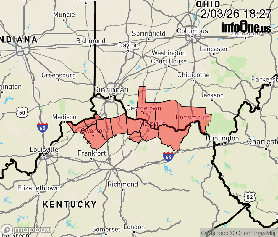 Canceled 2/3/26 9:45 PM Winter Weather Advisory issued February 3 at 6:25PM EST until February 3 at 10:00PM EST by NWS Wilmington OH * WHAT... Snow. Additional snow accumulations up to one inch. * WHERE... Portions of northeast and northern Kentucky and south central and southwest Ohio. * WHEN... Until 10 PM EST this evening. * IMPACTS... Plan on slippery road conditions. The hazardous conditions could impact the Tuesday evening commute. ![]() |