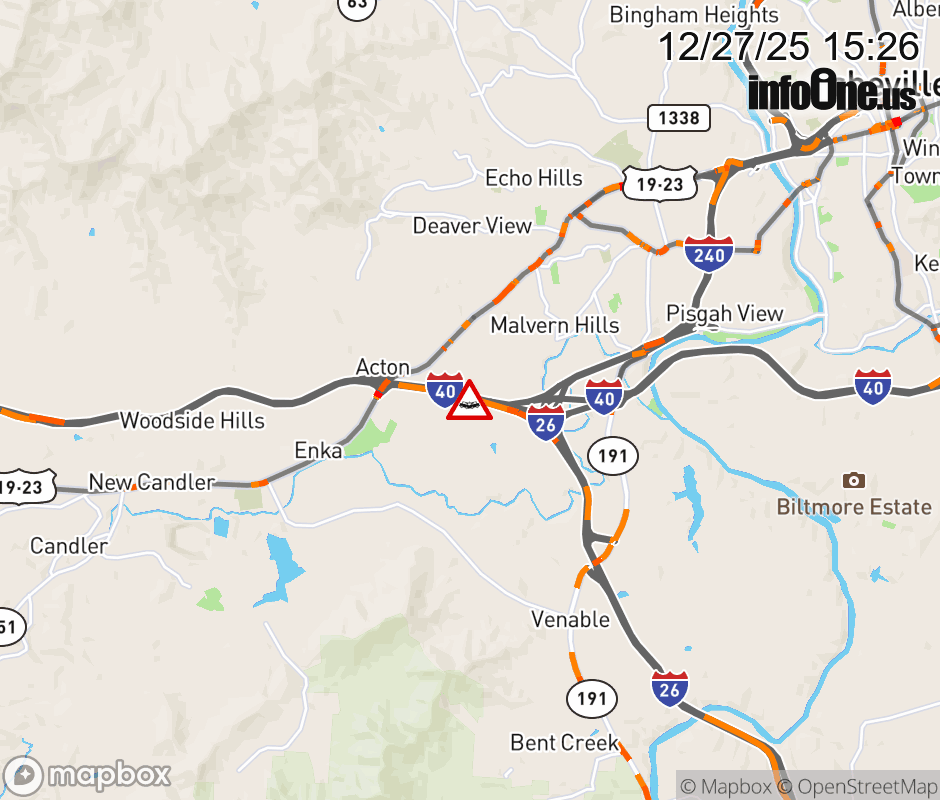 The right shoulder is closed one mile east of Exit 44, US 19/US 23/US 74 Alternate (Smokey Park Highway). Updated: Sat 12/27/25 3:26 PM EST ![]() Updated: Sat 12/27/25 3:26 PM EST |