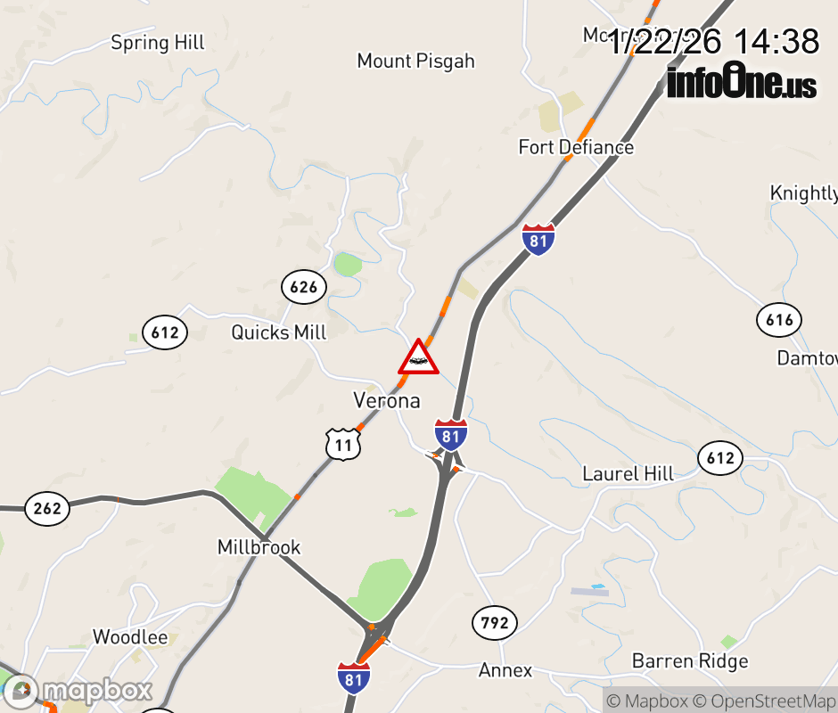 On US-11 in the County of Augusta, in the vicinity of Bald Rock Rd; Mill Race Rd; Rt. 781N/S (Augusta County), motorists can expect delays due to a vehicle crash. All south lanes are closed. ![]() |