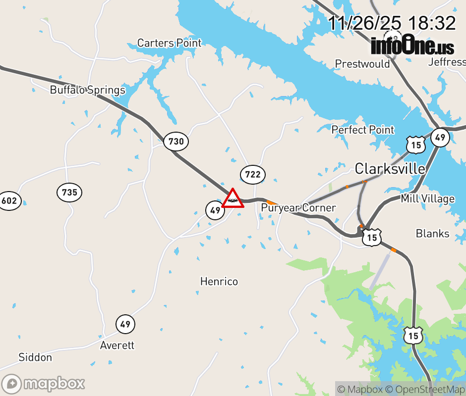On US-58 in the County of Mecklenburg, in the vicinity of Highway Forty-Nine; VA-49S; VA-49N/S, motorists can expect delays due to a vehicle crash. The east right lane and right shoulder are closed. Updated: Wed 11/26/25 6:32 PM EST ![]() |