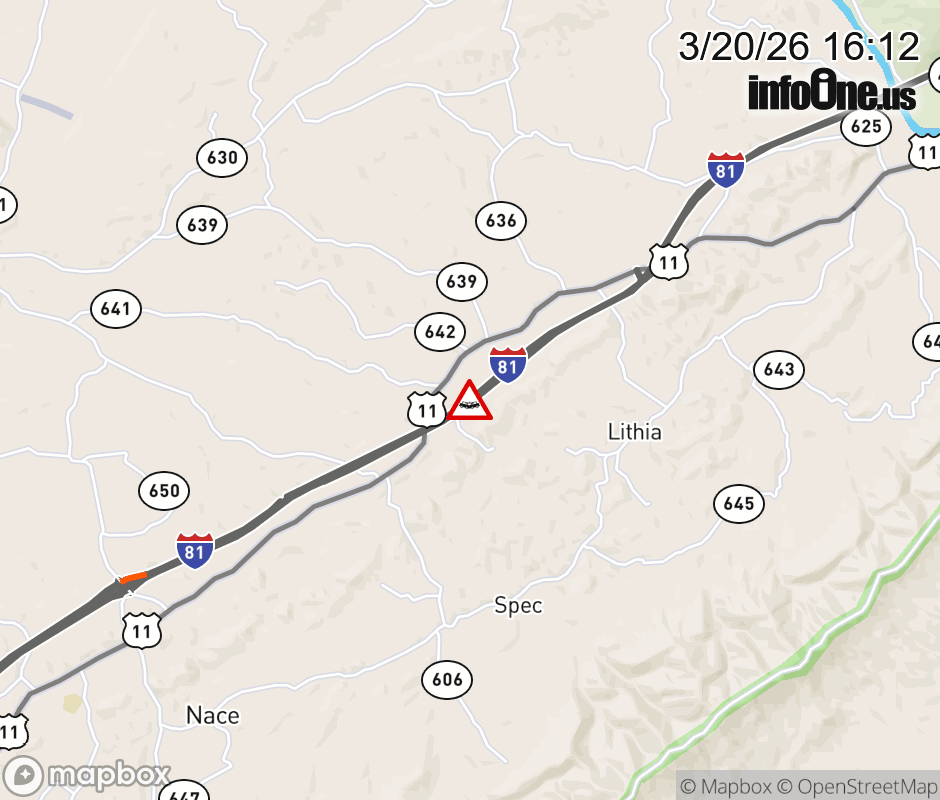 On I-81 at mile marker 160.1 in the County of Botetourt, motorists can expect delays due to a vehicle crash. The south left shoulder and left lane are closed. Updated: Fri 3/20/26 4:12 PM EDT ![]() Updated: Fri 3/20/26 4:12 PM EDT |