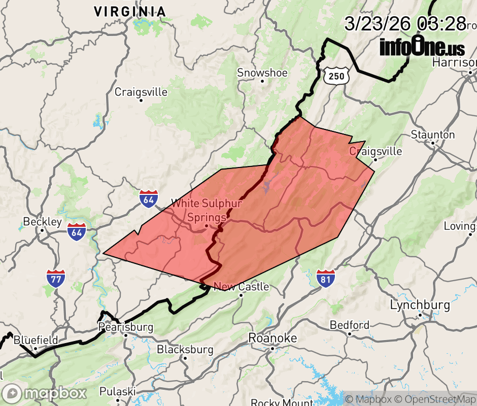Canceled 3/23/26 4:00 AM Special Weather Statement issued March 23 at 3:27AM EDT by NWS Blacksburg VA At 325 AM EDT, Doppler radar was tracking strong thunderstorms along a line extending from 8 miles south of Marlinton to near Alvon to Glenray. Movement was east at 55 mph. HAZARD...Wind gusts up to 50 mph. SOURCE...Radar indicated. IMPACT...Gusty winds could knock down tree limbs and blow around unsecured objects. Locations impacted include... Alleghany... Covington... Clifton Forge... Lewisburg... White Sulphur Springs... Ronceverte... and Alderson. ![]() |