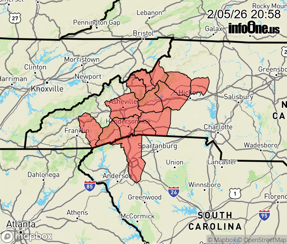 Canceled 2/6/26 12:57 AM High Wind Watch issued February 5 at 8:57PM EST until February 7 at 7:00PM EST by NWS Greenville-Spartanburg SC * WHAT... Northwest winds 20 to 30 mph with gusts up to 65 mph possible. * WHERE... Portions of western North Carolina and Upstate South Carolina. * WHEN... From Friday evening through Saturday evening. * IMPACTS... Damaging winds could blow down trees and power lines. Widespread power outages are possible. Travel could be difficult, especially for high profile vehicles. * ADDITIONAL DETAILS... The strong winds will result in cold wind chills across the mountains early Saturday morning, and some blowing snow near the Tennessee border. ![]() |