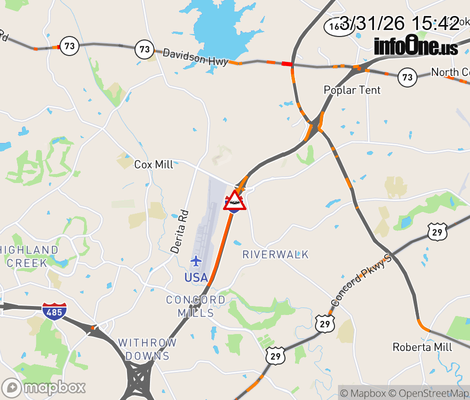 The right shoulder is closed at Exit 52 (Poplar Tent). Updated: Tue 3/31/26 3:42 PM EDT ![]() Updated: Tue 3/31/26 3:42 PM EDT |