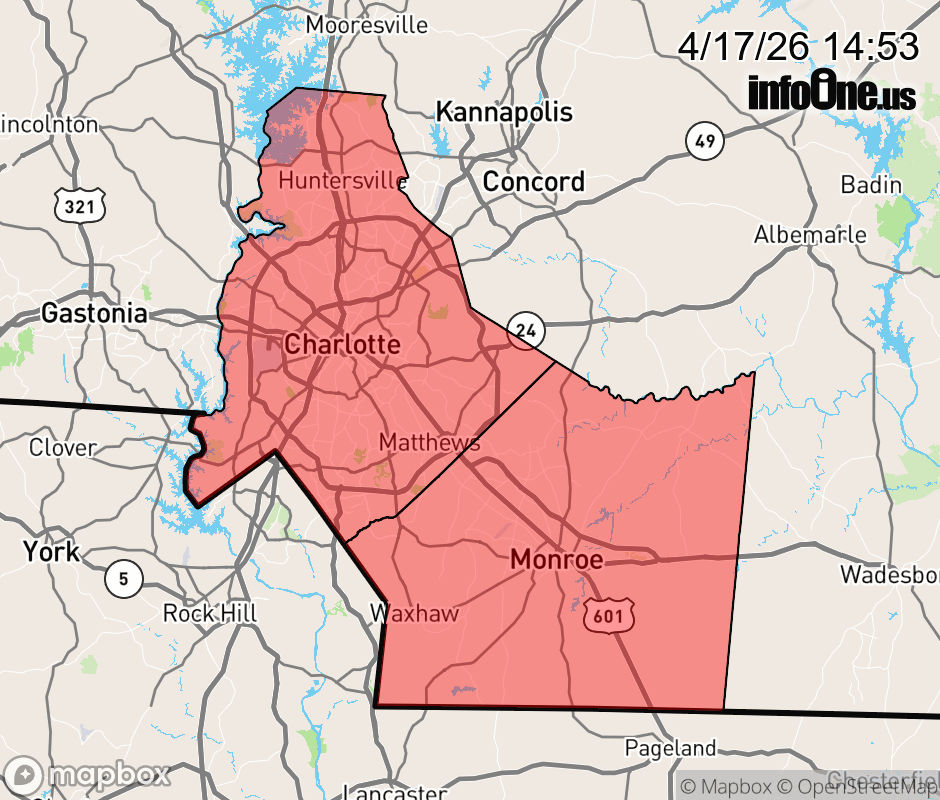 Canceled 4/17/26 8:00 PM Air Quality Alert issued April 17 at 2:51PM EDT by NWS Greenville-Spartanburg SC The North Carolina Department of Environmental Quality in Raleigh has issued a Code Orange Air Quality Action Day for Ground Level Ozone for Mecklenburg and Union Counties, until 8 PM EDT this evening. An Air Quality Action Day means that Ground Level Ozone concentrations within the region may approach or exceed unhealthy standards. For additional information, please visit the North Carolina Division of Air Quality Web site at https://airquality.climate.ncsu.edu/. ![]() |
