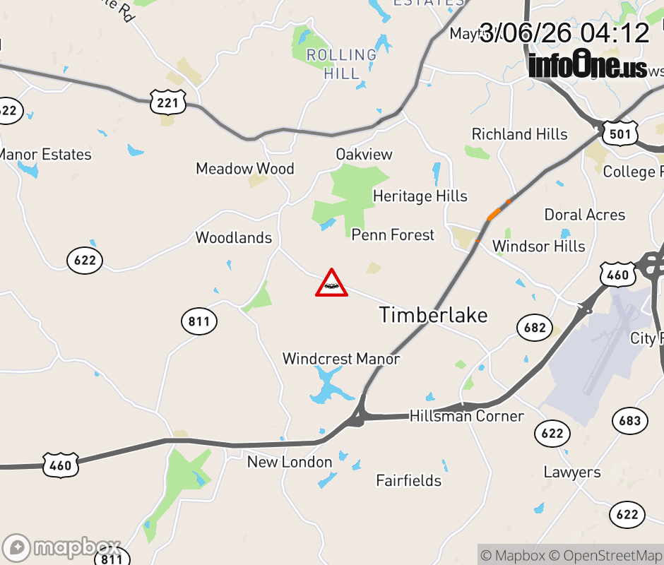 On Rt. 622 in the County of Bedford, in the vicinity of Valleywood Dr; Waterlick Rd; Whitney Pl; Rt. 622E/W (Campbell County); County/City/Town Line: BEDFORD - CAMPBELL COUNTY LINE, motorists can expect delays due to a vehicle crash. All east lanes are closed. All west lanes are closed. Updated: Fri 3/6/26 4:12 AM EST ![]() Updated: Fri 3/6/26 4:12 AM EST |