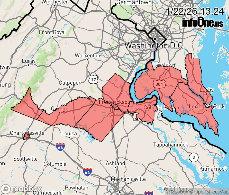 Canceled 1/22/26 8:29 PM Cold Weather Advisory issued January 22 at 1:22PM EST until January 24 at 10:00AM EST by NWS Baltimore MD/Washington DC * WHAT... Very cold wind chills as low as 5 below expected. * WHERE... In Maryland, Calvert, Charles, and St. Marys Counties. In Virginia, Albemarle, Greene, King George, Orange, Spotsylvania, and Stafford Counties. * WHEN... From 8 PM Friday to 10 AM EST Saturday. * IMPACTS... The cold wind chills as low as 5 below zero could result in hypothermia if precautions are not taken. ![]() |