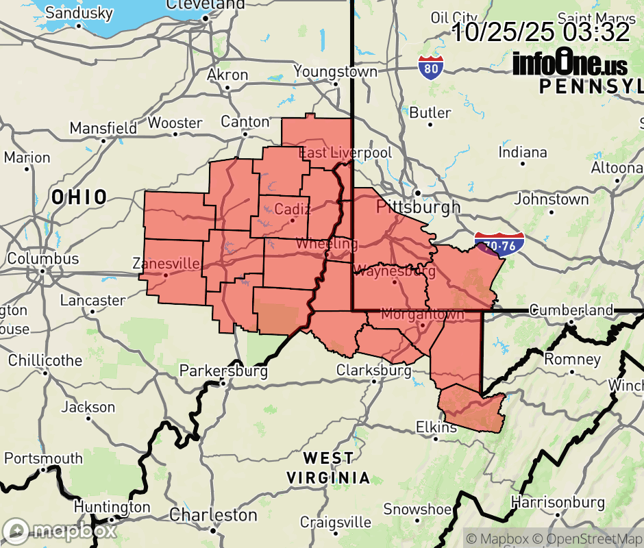 Canceled 10/25/25 9:00 AM Freeze Warning issued October 25 at 3:31AM EDT until October 25 at 9:00AM EDT by NWS Pittsburgh PA * WHAT... Sub-freezing temperatures as low as 30. * WHERE... Portions of east central Ohio, southwest Pennsylvania, and northern and the northern panhandle of West Virginia. * WHEN... Until 9 AM EDT this morning. * IMPACTS... Frost and freeze conditions could kill crops, other sensitive vegetation and possibly damage unprotected outdoor plumbing. ![]() |