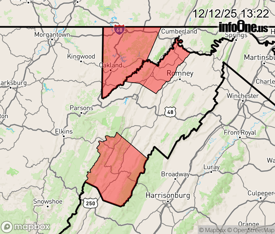 Canceled 12/12/25 6:52 PM Winter Weather Advisory issued December 12 at 1:20PM EST until December 14 at 1:00PM EST by NWS Baltimore MD/Washington DC * WHAT... Snow expected. Total snow accumulations of 2 to 4 inches. Winds gusting as high as 35 mph. * WHERE... In Maryland, Eastern Garrett County. In West Virginia, Western Mineral and Western Pendleton Counties. * WHEN... From 4 PM Saturday to 1 PM EST Sunday. * IMPACTS... Plan on slippery road conditions. * ADDITIONAL DETAILS... Snow will most likely start between 4 and 6 PM. The heaviest snow will likely fall between 6 PM and Midnight. Visibility may be reduced in snow and blowing snow to around a quarter to half of a mile at times. ![]() |