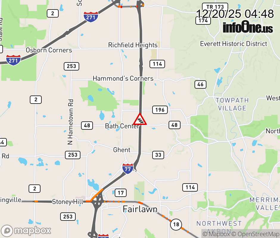 The right lane is blocked on I-77 South beyond Summit County Rest Area 4-32, due to repairs/maintenance. Updated: Sat 12/20/25 4:48 AM EST ![]() Updated: Sat 12/20/25 4:48 AM EST |