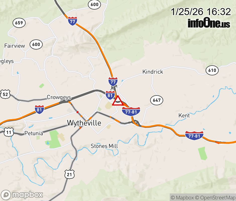 On I-81 at mile marker 72.9 in the County of Wythe, motorists can expect delays due to a vehicle crash. The north right shoulder is closed. Updated: Sun 1/25/26 4:32 PM EST ![]() Updated: Sun 1/25/26 4:32 PM EST |