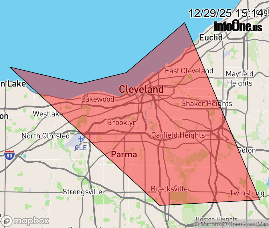 Canceled 12/29/25 3:30 PM Snow Squall Warning issued December 29 at 3:13PM EST until December 29 at 3:30PM EST by NWS Cleveland OH At 312 PM EST, a dangerous snow squall was located along a line extending from 23 miles northwest of Avon Lake to near Warrensville Heights, moving east at 35 mph. HAZARD...Whiteout conditions with near zero visibility associated with intense bursts of heavy snow and gusty winds leading to blowing snow. Wind gusts greater than 35 mph. SOURCE...Radar indicated. IMPACT...Travel will become difficult and potentially dangerous within minutes. Potential impacts to portions of I-90, I-71, I-480 and State Route 176 within Cuyahoga County and far eastern Lorain County. Locations impacted include... Cleveland, Parma, Lakewood, Cleveland Heights, Westlake, North Royalton, Solon, Twinsburg, Warrensville Heights, Macedonia, Highland Hills, Garfield Heights, Shaker Heights, Maple Heights, South Euclid, Parma Heights, Rocky River, Broadview Heights, Brook Park, and East Cleveland. ![]() |