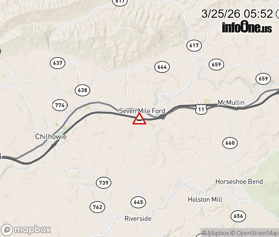 On I-81 at mile marker 38.5 in the County of Smyth, motorists can expect delays due to a vehicle crash. The north right shoulder is closed. ![]() |