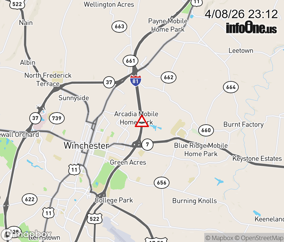 On I-81 North at mile marker 316.3 in the County of Frederick, motorists can expect delays due to a tractor trailer crash. Updated: Wed 4/8/26 11:12 PM EDT ![]() Updated: Wed 4/8/26 11:12 PM EDT |