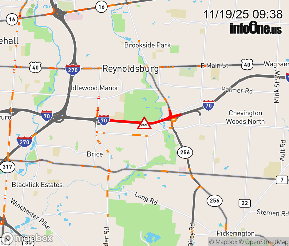 The right shoulder is blocked on I-70 West beyond SR-256, due to a disabled vehicle. Updated: Wed 11/19/25 9:38 AM EST ![]() Updated: Wed 11/19/25 9:38 AM EST |