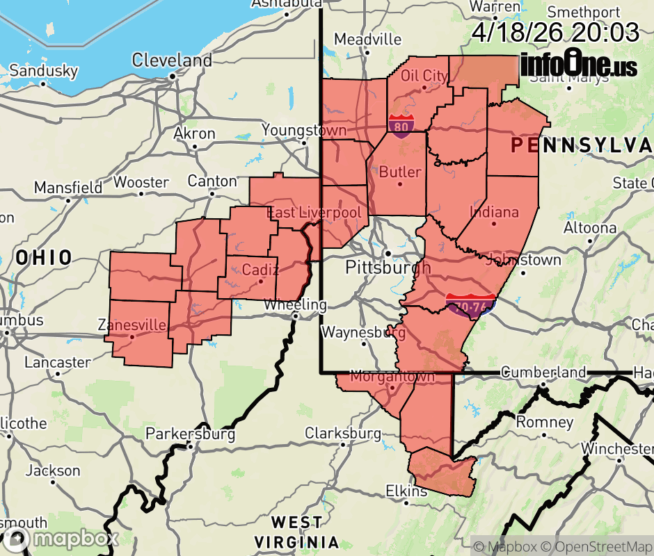 Canceled 4/19/26 12:31 AM Freeze Watch issued April 18 at 8:01PM EDT until April 20 at 9:00AM EDT by NWS Pittsburgh PA * WHAT... Sub-freezing temperatures as low as 29 possible. * WHERE... Portions of east central Ohio, northwest, southwest, and western Pennsylvania, and northern West Virginia. * WHEN... From late Sunday night through Monday morning. * IMPACTS... Frost and freeze conditions could kill crops, other sensitive vegetation and possibly damage unprotected outdoor plumbing. ![]() |