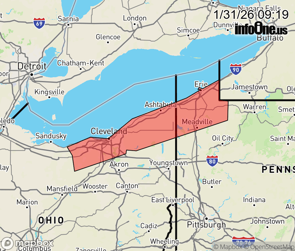 Canceled 1/31/26 10:45 AM Special Weather Statement issued January 31 at 9:18AM EST by NWS Cleveland OH At 915 AM EST, radar indicated snow showers along a line extending from near Clymer to Vermilion, moving southeast at 15 mph. HAZARDS INCLUDE... Visibility dropping to less than three quarters of a mile at times... Up to 1 inch of quick snow accumulation... Locations impacted include... Cleveland, Erie, Lorain, Elyria, Painesville, Ashtabula, Willowick, Meadville, Conneaut, Vermilion, Western Vermilion, Chardon, Fairport Harbor, Geneva-On-The-Lake, Parma, Lakewood, Euclid, Mentor, Cleveland Heights, and Strongsville. Use extra caution if you must travel. Rapid changes in visibility and potentially slick roads may lead to accidents. ![]() |