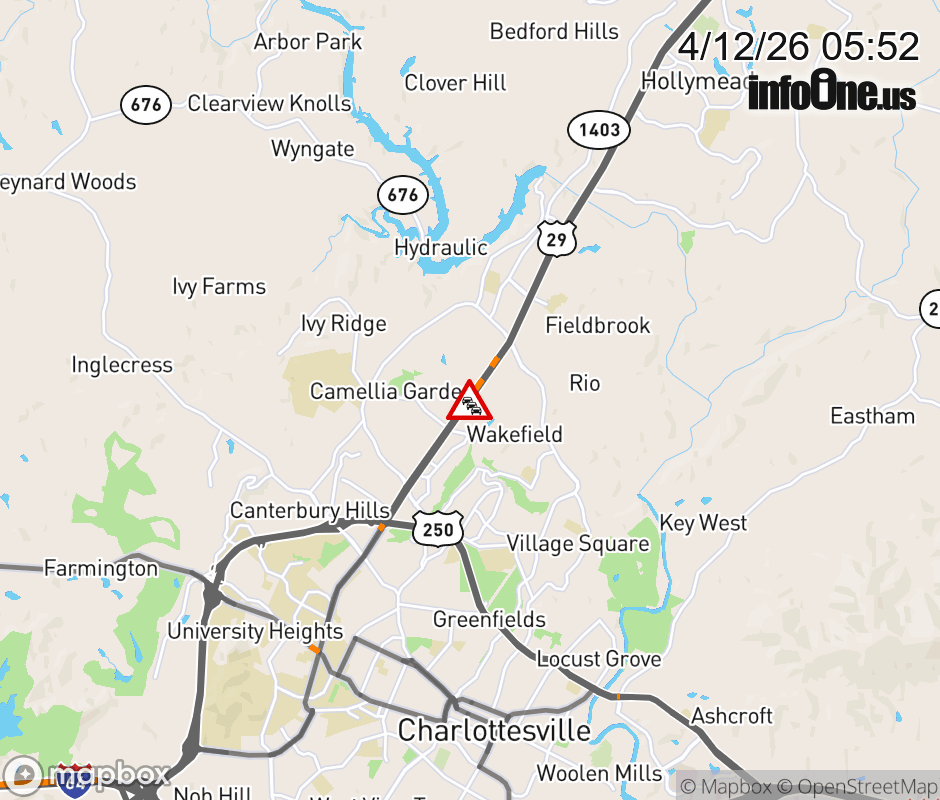 On US-29 in the County of Albemarle, in the vicinity of Branchlands Blvd; Crossover; Rt. 1694S (Albemarle County); Rt. 1694N (Albemarle County); Rt. 1694N/S (Albemarle County), motorists can expect delays due to other security/police activity. The north left shoulder, left lane, left center lane, and right center lane are closed. Updated: Sun 4/12/26 5:52 AM EDT ![]() Updated: Sun 4/12/26 5:52 AM EDT |