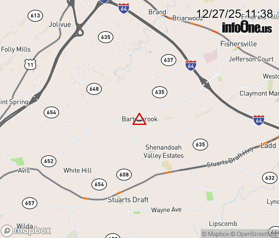 On Rt. 648 in the County of Augusta, in the vicinity of Tinkling Spring Rd; Rt. 608N/S (Augusta County), motorists can expect delays due to a vehicle crash. All west lanes are closed. ![]() |