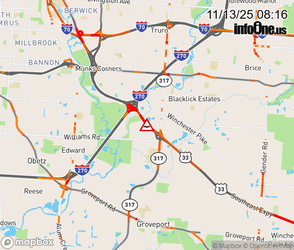The right shoulder is blocked on US-33 East beyond I-270 North, due to a crash. Updated: Thu 11/13/25 8:16 AM EST ![]() Updated: Thu 11/13/25 8:16 AM EST |