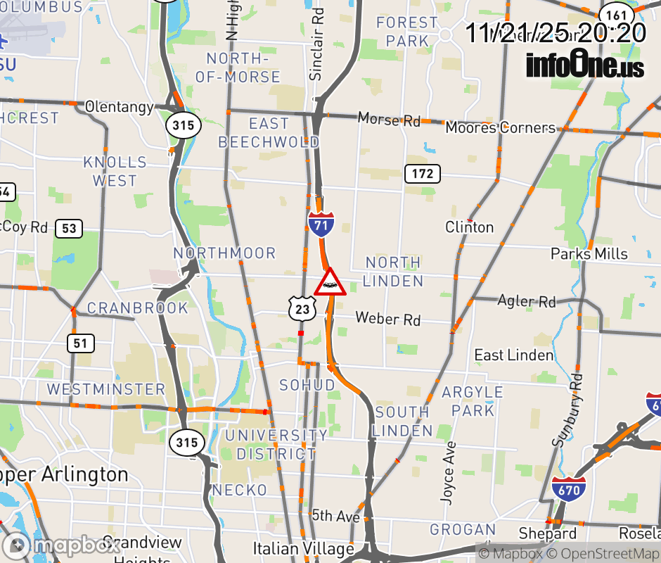 The right shoulder is blocked on I-71 South beyond North Broadway, due to a crash. Updated: Fri 11/21/25 8:20 PM EST ![]() Updated: Fri 11/21/25 8:20 PM EST |