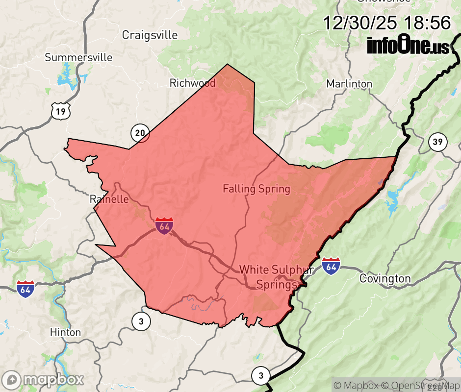 Canceled 12/31/25 2:10 AM Winter Weather Advisory issued December 30 at 6:55PM EST until January 1 at 10:00AM EST by NWS Blacksburg VA * WHAT... Heavy snow expected. Total snow accumulations between 3 and 5 inches and ice accumulations around a light glaze. Winds gusting as high as 45 mph. * WHERE... Western Greenbrier County. * WHEN... From 4 PM Wednesday to 10 AM EST Thursday. * IMPACTS... Accumulating snow could result in slick roads and hazardous travel conditions for the Wednesday evening and Thursday morning commutes. Gusty winds could bring down tree branches. ![]() |