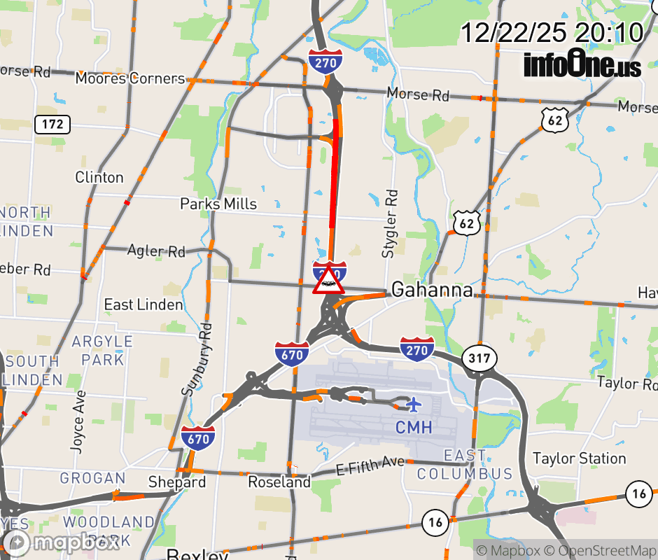 The right shoulder is closed on I-270 South at I-670 West, due to a crash. Updated: Mon 12/22/25 8:10 PM EST ![]() Updated: Mon 12/22/25 8:10 PM EST |