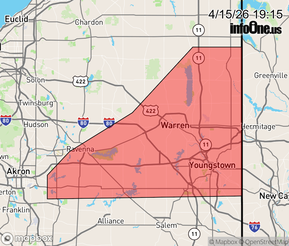 Canceled 4/15/26 7:27 PM Severe Thunderstorm Warning issued April 15 at 7:14PM EDT until April 15 at 8:00PM EDT by NWS Cleveland OH At 714 PM EDT, severe thunderstorms were located along a line extending from near Cortland to Warren to 9 miles southeast of Ravenna, moving east at 50 mph. HAZARD...60 mph wind gusts and quarter size hail. SOURCE...Radar indicated. IMPACT...Minor damage to vehicles is possible. Expect damage to trees and power lines. Locations impacted include... Youngstown, Warren, Ravenna, Boardman, Niles, Campbell, Hubbard, Canfield, Cortland, Newton Falls, Mogadore, Lordstown, Kinsman, Vienna Center, Leavittsburg, Hilltop, Maplewood Park, Bristolville, Austintown, and Struthers. ![]() |