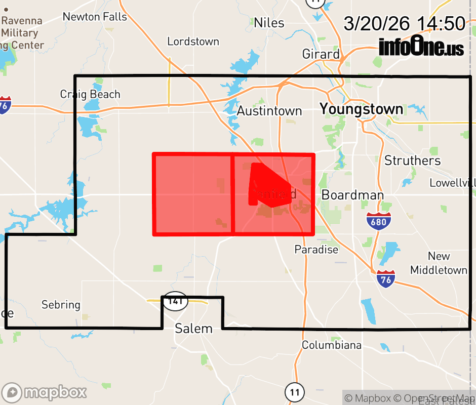 Canceled 3/20/26 6:50 PM Mahoning County has 1 power outage affecting 1 customer. Ohio Edison 1 without power Youngstown: Customers affected: 19 (< 1%) Estimated repair: Fri 8:30 PM Updated: Fri 3/20/26 6:20 PM EDT ![]() Updated: Fri 3/20/26 2:50 PM EDT |