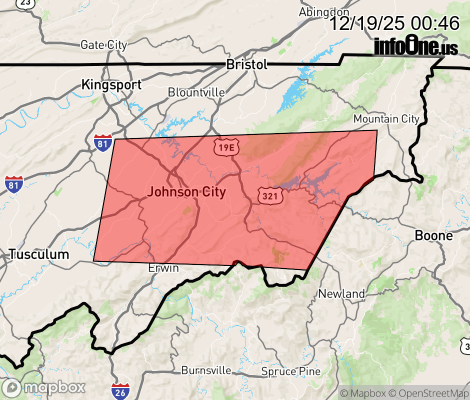 Canceled 12/19/25 1:11 AM Severe Thunderstorm Warning issued December 19 at 12:45AM EST until December 19 at 1:30AM EST by NWS Morristown TN SVRMRX The National Weather Service in Morristown has issued a * Severe Thunderstorm Warning for... South central Sullivan County in east Tennessee... Washington County in east Tennessee... Northeastern Unicoi County in east Tennessee... Southwestern Johnson County in east Tennessee... Carter County in east Tennessee... * Until 130 AM EST. * At 1244 AM EST, a severe thunderstorm was located over Jonesborough, or near Johnson City, moving east at 45 mph. HAZARD...60 mph wind gusts. SOURCE...Radar indicated. IMPACT...Expect damage to roofs, siding, and trees. * Locations impacted include... Johnson City, Elizabethton, Erwin, Jonesborough, Central, Midway, Pine Crest, Gray, Oak Grove, and Hampton. This includes Interstate 26 in Tennessee between mile markers 11 and 36. ![]() |