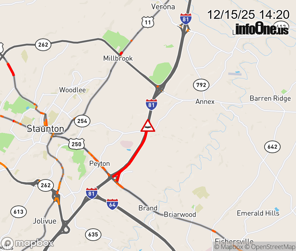 On I-81 North at mile marker 224.5 in the County of Augusta, motorists can expect delays due to a vehicle crash. Traffic backups are approximately 1.5 miles. Updated: Mon 12/15/25 2:20 PM EST ![]() Updated: Mon 12/15/25 2:20 PM EST |