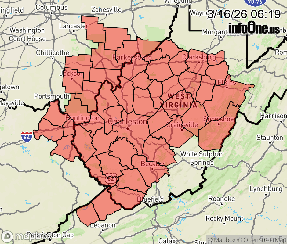 Canceled 3/16/26 10:52 AM Wind Advisory issued March 16 at 6:18AM EDT until March 16 at 11:00AM EDT by NWS Charleston WV * WHAT... Southwest winds 15 to 25 mph with gusts up to around 45 mph expected. * WHERE... Portions of northeast Kentucky, southeast Ohio, southwest Virginia, and central, northeast, northern, southeast, southern, and western West Virginia. * WHEN... Until 11 AM EDT this morning. * IMPACTS... Gusty winds will blow around unsecured objects. Tree limbs could be blown down and a few power outages may result. ![]() |