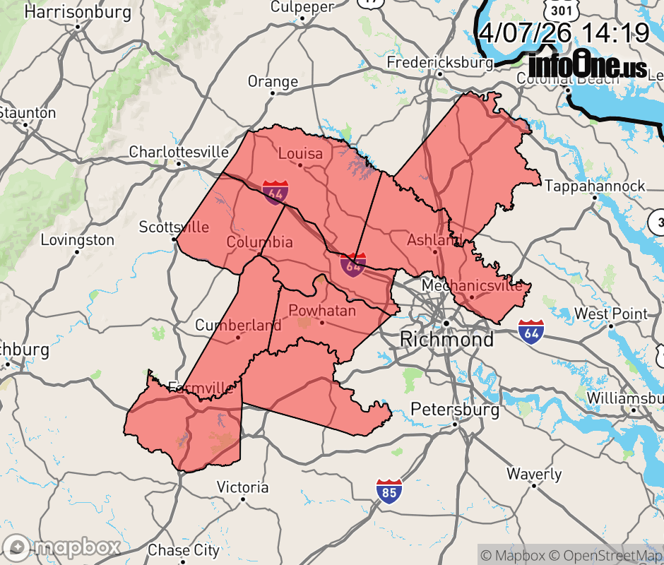 Canceled 4/8/26 4:06 AM Freeze Warning issued April 7 at 2:18PM EDT until April 8 at 9:00AM EDT by NWS Wakefield VA * WHAT... Sub-freezing temperatures as low as 30 expected. * WHERE... Amelia, Cumberland, Eastern Louisa, Fluvanna, Goochland, Powhatan, Prince Edward, Western Hanover, Western Louisa, and Caroline Counties. * WHEN... From 2 AM to 9 AM EDT Wednesday. * IMPACTS... Frost and freeze conditions could kill crops, other sensitive vegetation and possibly damage unprotected outdoor plumbing. ![]() |