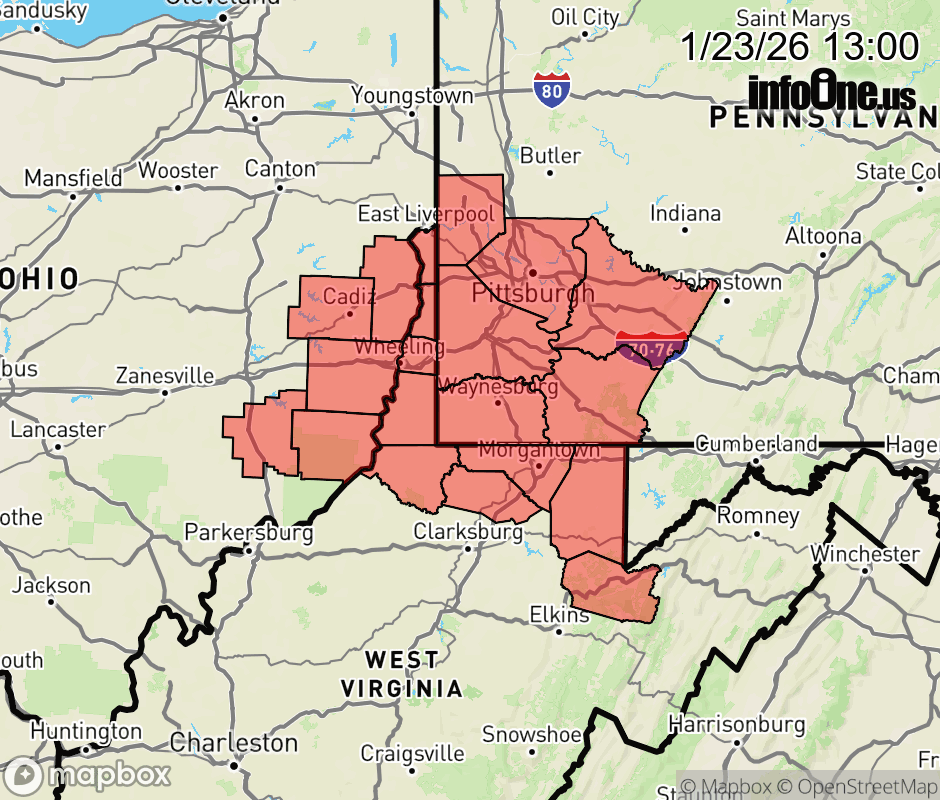 Canceled 1/23/26 8:08 PM Cold Weather Advisory issued January 23 at 12:59PM EST until January 24 at 7:00AM EST by NWS Pittsburgh PA * WHAT... Very cold wind chills between 10 below and 15 below zero expected. * WHERE... Portions of east central Ohio, southwest and western Pennsylvania, and northern and the northern panhandle of West Virginia. * WHEN... From 4 PM this afternoon to 7 AM EST Saturday. * IMPACTS... The cold wind chills as low as 15 below zero could result in hypothermia if precautions are not taken. ![]() |