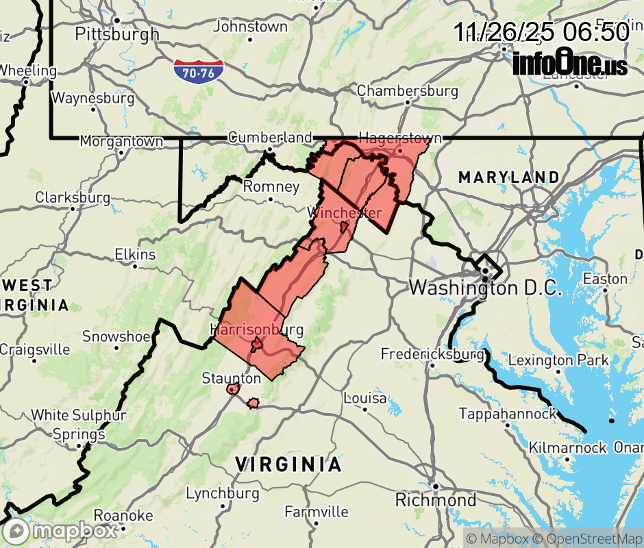 Dense Fog Advisory issued November 26 at 6:46AM EST until November 26 at 9:00AM EST by NWS Baltimore MD/Washington DC * WHAT... Visibility one quarter mile or less in dense fog. * WHERE... In Maryland, Washington County. In Virginia, Frederick VA, Shenandoah, Augusta, and Rockingham Counties. In West Virginia, Berkeley, Jefferson, and Morgan Counties. * WHEN... Until 9 AM EST this morning. * IMPACTS... Low visibility could make driving conditions hazardous. ![]() |