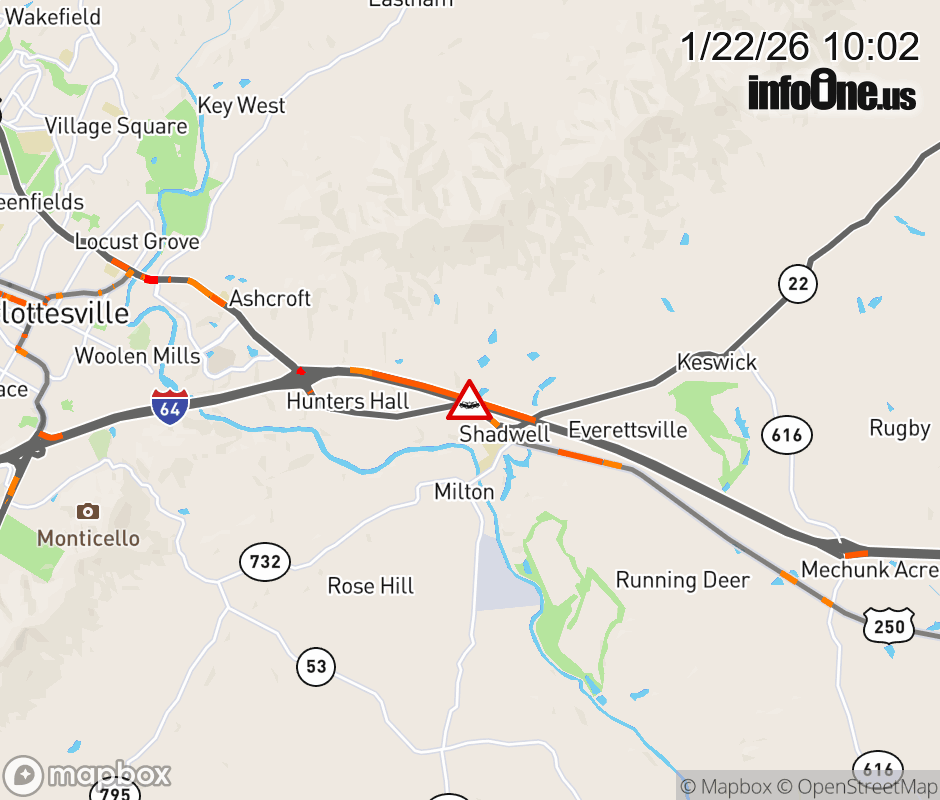 On I-64 West at mile marker 126.1 in the County of Albemarle, motorists can expect delays due to a vehicle crash. Traffic backups are approximately 1.0 mile. Updated: Thu 1/22/26 10:02 AM EST ![]() Updated: Thu 1/22/26 10:02 AM EST |