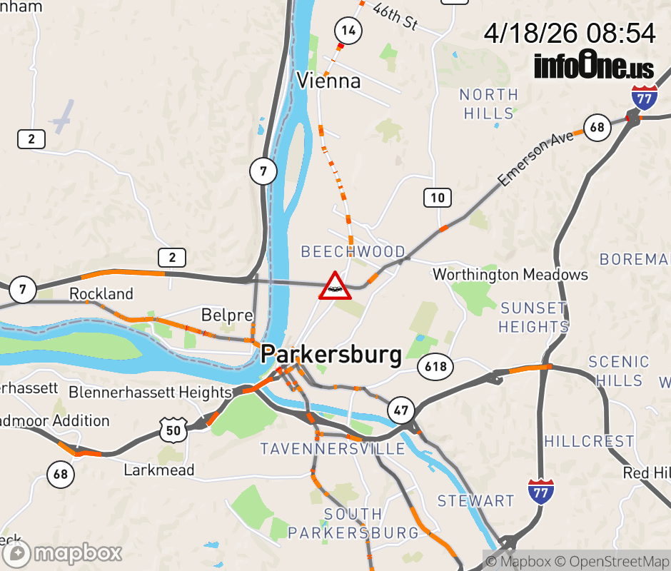 Vehicle Crash on WV-14 (Ohio Ave) & WV-68 (Emerson Ave) in Parkersburg. Comments:Area of Memorial Bridge Approach. Updated: Sat 4/18/26 8:54 AM EDT ![]() Updated: Sat 4/18/26 8:54 AM EDT |