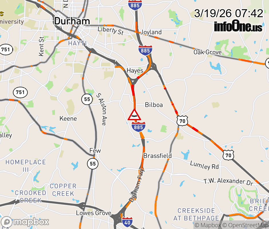 The left shoulder is closed at Exit 9 (NC-147). Updated: Thu 3/19/26 7:42 AM EDT ![]() Updated: Thu 3/19/26 7:42 AM EDT |